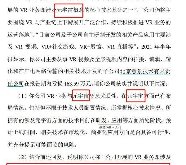 11月7日晚,佳创视讯多个涉及元宇宙的问题被关注,如此前公司在互动平台表示“公司开展的VR业务即涉及元宇宙概念的核心技术基础之一”,深交所要求说明上述论断的原因、依据,及相关表述是否严谨、合理,是否存在主动迎合市场热点炒作公司股价的情形。