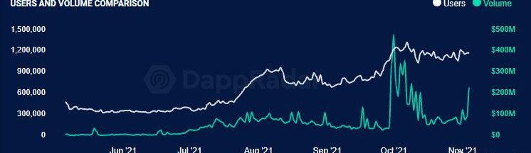 从2021年7月以来,链游数据迅猛增长,玩家从4月初的8万人增长到10月的133万人,月均增幅270%多;日交易量从4月初的50万美元左右增长到10月初5.44亿美元左右的水平,平均每个月增长超181倍,让人们看到了GameFi领域未来无穷的潜力。