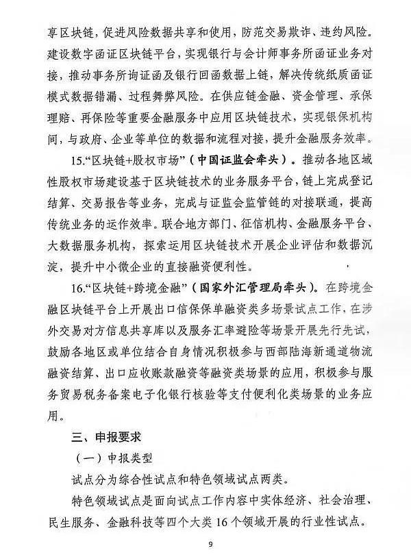 近日,中央网信办会同中央宣传部、国务院办公厅[电子政务办公室]、最高人民法院、最高人民检察院、教育部、工业和信息化部、民政部、司法部、人力资源社会保障部、国家卫生健康委、中国人民银行、国务院国资委、国家税务总局、中国银保监会、中国证监会、国家能源局、国家外汇管理局等18个部门和单位,组织开展国家区块链创新应用试点行动。其中,申报试点分为特色领域试点和综合性试点两类: