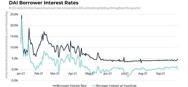 包括COMP借款人的激励措施在内,7月份市场的低谷时,利率触及0%。直到本季度后半段,随着Compound最受欢迎的借款市场--USDC和DAI的利用率增加,利率才开始回升。