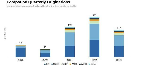在5月的市场崩溃和随后的经济放缓之后,各项指标全面下降,在2021年第三季度末,活动大幅回升。到本季度末,Compound的未偿贷款和存款达到了历史新高--如果不是9月30日COMP分配错误后从Compound市场撤出约30亿美元,这个数字甚至会更高。