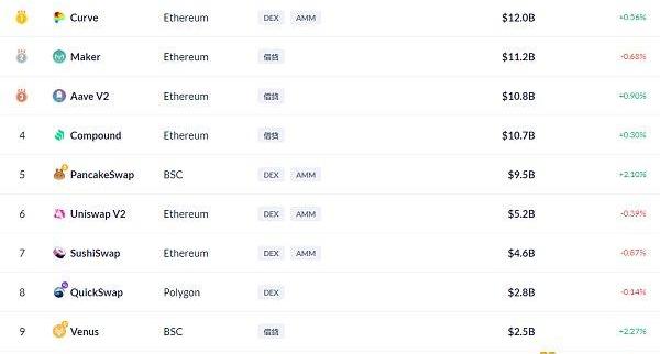 BSC链上DeFi锁定资产前十排名及锁仓量,数据来源:Debank