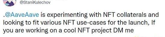 7月,去中心化借贷协议?Aave?创始人StaniKulechov发推称,目前Aave正在试验将NFT作为抵押品,并希望发布时协议适合各种NFT用例。