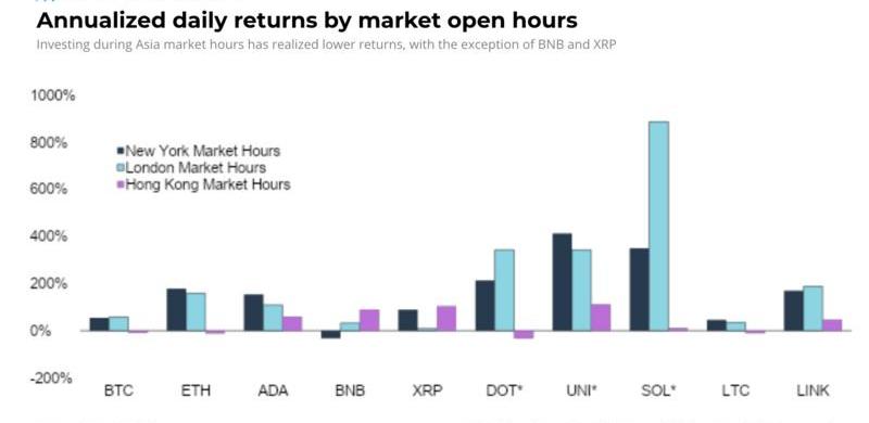 加密货币和传统市场之间的一个关键区别是数字资产的24/7性质——与股票不同,交易不受交易所开放日期和时间的约束。但即使代币本质上是全球性的,市场参与者仍然受制于时区差异和睡眠需求。当将交易日分解为传统的市场开放时间时,很明显,持有加密货币的回报不会随时间线性增长。