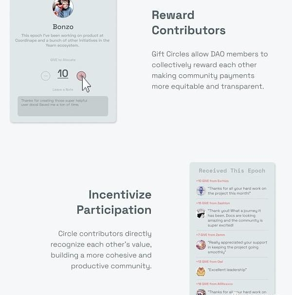 Coordinape是一种基于同行的薪酬工具,其前提是工作组的贡献者自己最清楚谁创造了最大的价值。由于贡献来自于边缘,关于每个贡献者所增加的价值的知识也在边缘。在某个工作阶段结束时,Coodinape允许工作组内的成员自行决定将奖励分配给同伴。这就不需要一个中央奖励分配机构来确定细粒度的价值创造。