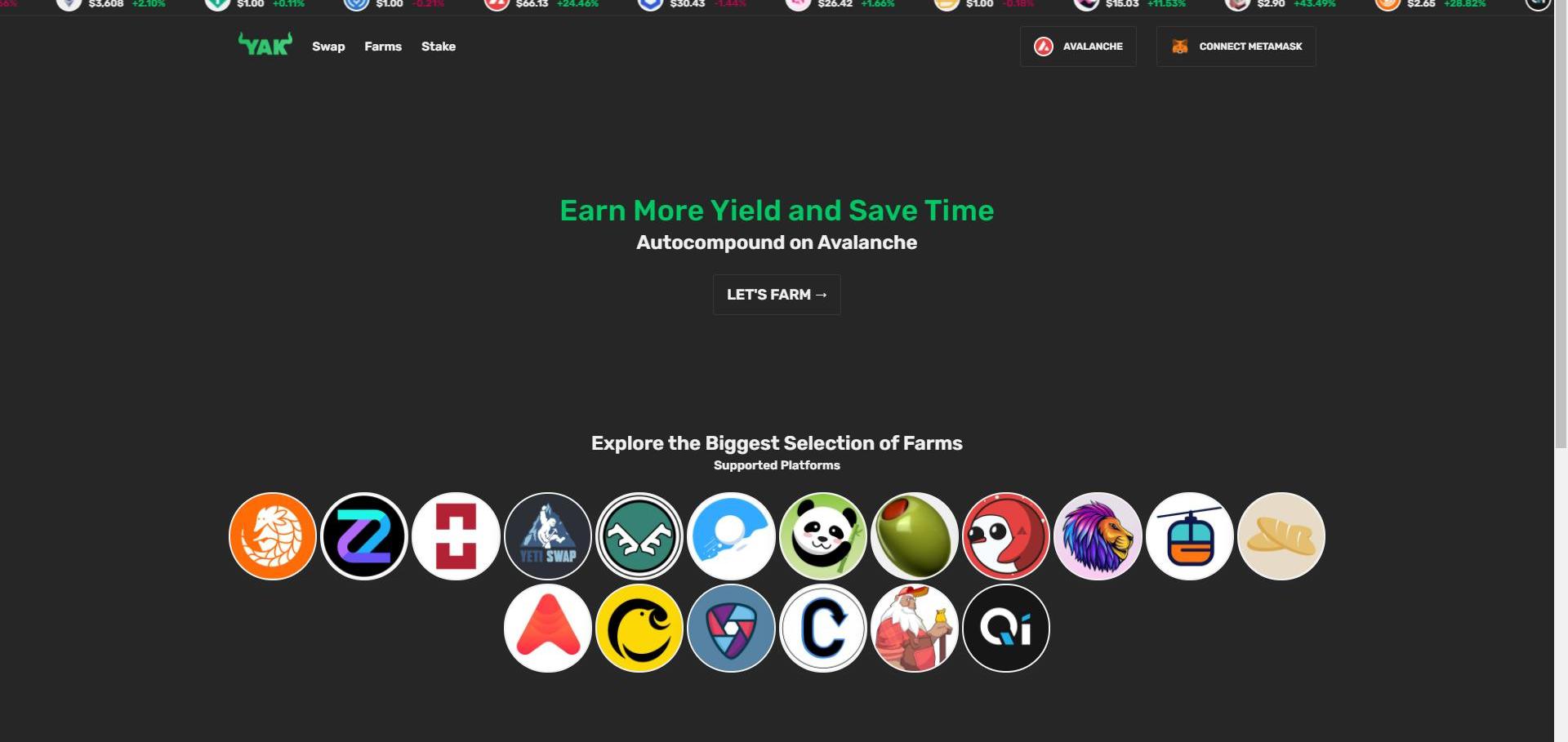 YieldYak是最有吸引力的平台之一。该平台在总存款额方面仅次于Pangolin,位居第二。它的主要产品,YY农场,是一个自动合成器,通过在Avalanche网络的不同协议中进行收益率耕作获得的奖励,自动产生复利。YieldYak农场允许用户存入一项资产以赚取更多的该资产。存款时,每个用户的存款将与其他用户的存款整合,并以更大体量进行Defi收益运作。