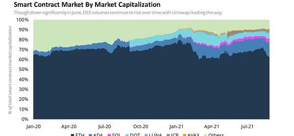 上图:自2020年6月开始,锁定在各大智能合约平台中的总价值(TVL)增长情况。在TLV总价值方面,以太坊仍然占主导地位,其他链仍与以太坊存在很大的差距。图源:Messari