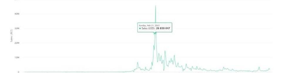 任何处在真空中的事物似乎都是一个「触顶」的指标,就像勒布朗在一场毫无意义的常规赛中扣篮的视频剪辑,以20.8万美元的售价卖出一样,似乎表明2月份的NBATopShot,或者当Cryptokitties在12月17日达到6位数的销售额时,也标志着触顶。
