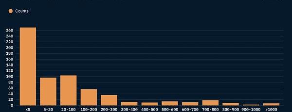 只有80个项目实现了300个ETH及以上的一级销售收入。ETH收入中位数为10.2个ETH。
