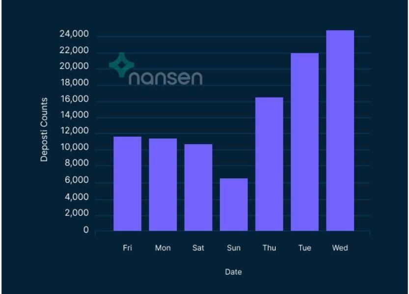 6月,以太坊的价值几乎减半。之后,我们看到6月份的不同日子里,存款数量出现了奇怪的峰值。