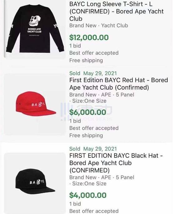 2021年5月29日,BAYC发布公告,宣布向所有猿猴NFT持有者发放专属限量周边,包括150顶黑色棒球帽、60顶红色棒球帽、150件长袖T恤、150件短袖T恤,会员售价非常低廉。最终,510件商品在6分钟内售罄。而这些周边在之后二级市场的价格令人瞠目;