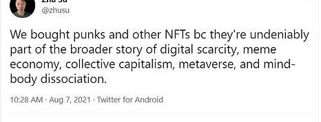 所以下次当你问自己为什么人们愿意把数百万美元投入NFT时,记住这一点:虚拟世界和现实之间的界限越来越模糊,其背后可能有一系列身份、文化和社区提供了无形的社会价值。三箭资本的联合创始人苏朱对这篇论文进行了精彩的总结: