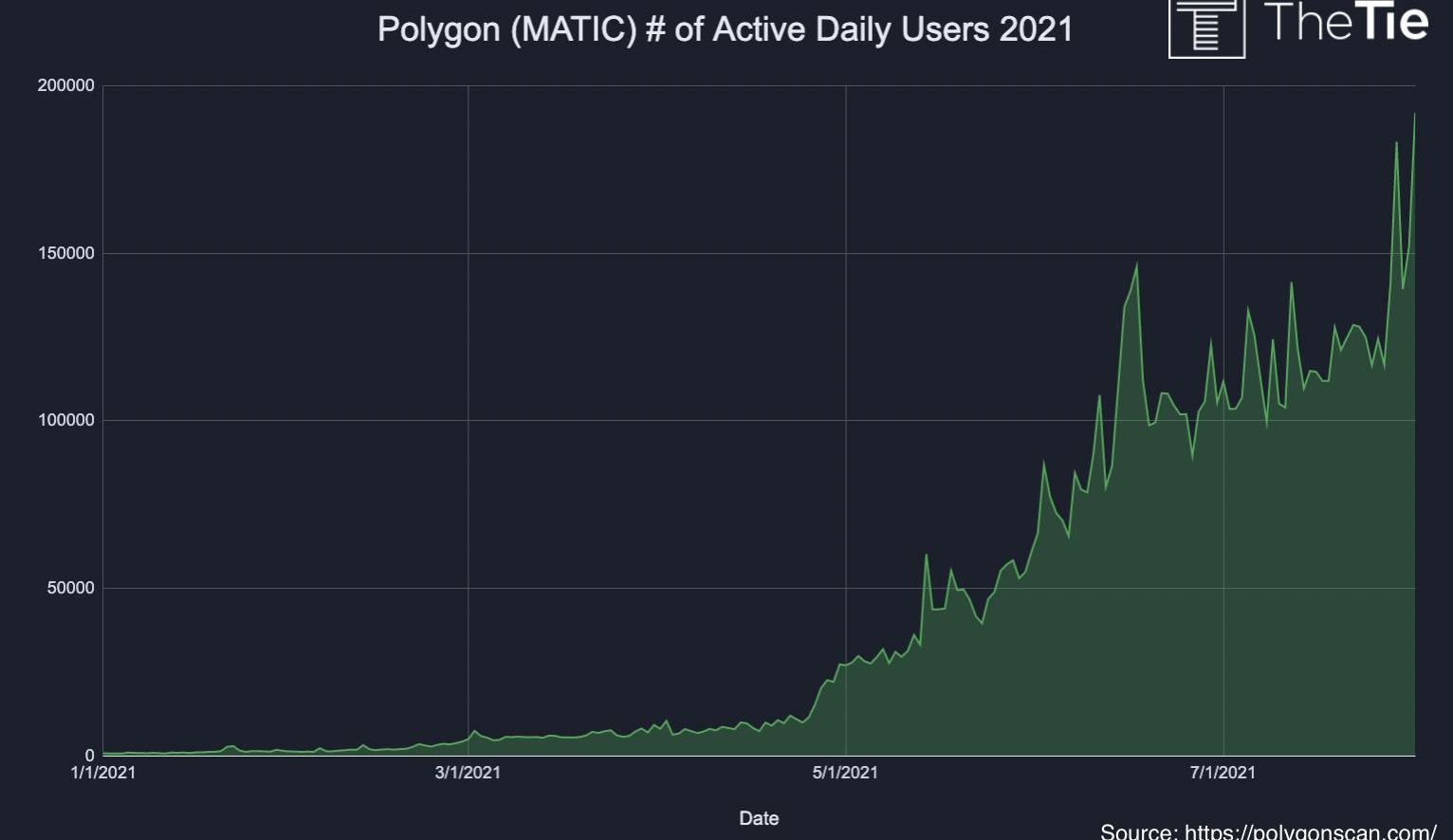 Polygon网络上的日活跃用户数,是实际采用的良好指标,在8个月期间也急剧增加,并与地址的指数式增长成比例。Polygon上的日活跃用户从2021年初的大约750人,增加到8月1日的19.2万人,增长了25000%。