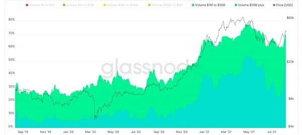自8月初以来,价值至少100万美元的比特币链上交易额增长了10%,占总转移价值的近70%。