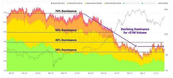 与此同时,小规模交易在整个市场中所占的百分比有所下降,如下图所示。自2020年7月以来,价值低于100万美元的交易已从市场主导地位的70%降至约30-40%。