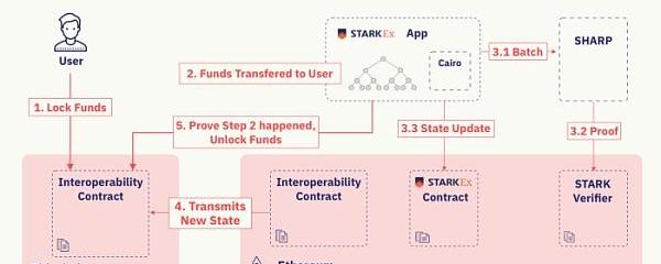 第四步:以太坊上的专用合约将新的L1状态发送到侧链的互操作性合约中。该状态(即StarkEx上所有交易的默克尔根)确认用户已按要求收到StarkEx上的资金。