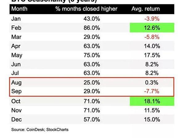 与股票类似,比特币正在接近一个季节性的疲软期,这可能会鼓励买家获利。下表显示,在八年的时间里,8月的平均收益相对较弱。9月往往是最差的月份。买盘在10月和2月回升。