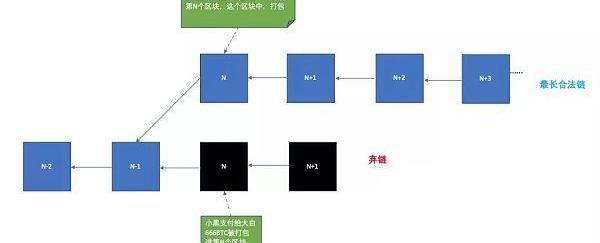 假设小黑给大白发了666BTC,并被打包到了第N个区块。没过几分钟,小黑反悔了,通过自己控制的超过50%的算力,发起了51%算力攻击,通过剔除发给大白的666BTC那笔交易,重组第N个区块,并在重组的第N个区块后面继续延展区块,使之成为最长合法链。