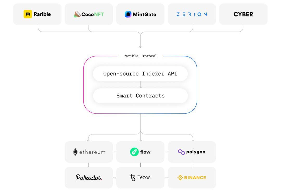RaribleProtocol是一组可以部署到各种区块链的智能合约,也是一个开源索引器。项目可以使用这些工具来构建面向消费者的应用程序,而智能合约开发人员可以在协议中构建有利于整个项目生态系统的功能。