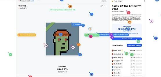 PartyBid让NFT更具社交性,它用开派对的形式,让成百上千的人有机会一同购买、拥有和管理昂贵的NFT。这个网站的社交属性很明显,网页会实时显示移动的鼠标光针和用户发出的评论。在上周五的拍卖中,有几百个人参与,屏幕里到处都是移动的光标和表情符号,场面非常壮观。这种感觉很难用语言描述,你可以亲自去看看。