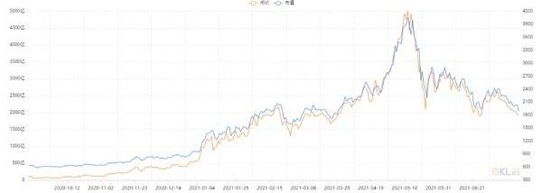 2021年以来,以太坊经历了大起大落,而其市值和币价保持一致的走势。五月份前,以太币呈现上升趋势,在五月份当月更是直线拉高,5月12日币价达到4198.19美元的高点,市值一度接近5000亿美元。