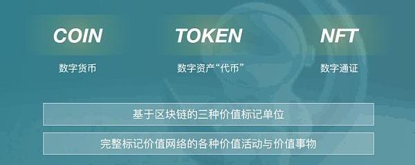 Coin、Token、NFT这三个基于区块链的三种价值标记单位,是元宇宙数字经济活动的价值标志物,但是三个起着不同的作用,它们分别代表:数字货币、数字资产、数字通证,完整标记价值网络的各种价值活动与价值事物。
