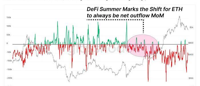 随着价格下跌,数字货币交易所内的ETH余额继续呈下降趋势,这说明ETH在以太坊自身生态系统中依然举足轻重,因为大多数DeFi协议都需要ETH代币作为基础层抵押品。自去年夏季的“DeFi热潮”以来,数字货币交易所内的ETH逐月累计流出量一直持续增加,这表明资本不断从中心化交易所转移到DeFi生态系统。