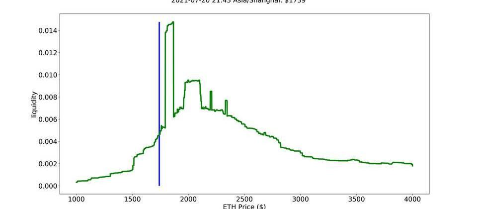 上图为07月18日,市场价格为$1976,下图为7月20日,市场价格为$1739。虽然ETH价格下跌了很多,但是还是有很多的流动性集中在$1950-$2100这个区间。这些LP提供者是在承受着比较大的无常损失,如果他们决定进行调仓,那么对市场是有额外的卖压。