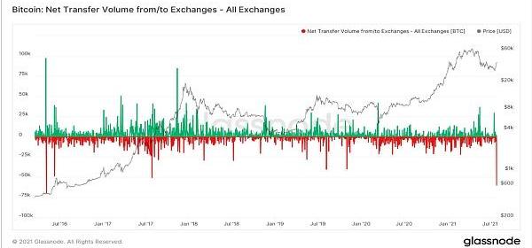 由于在6.4万美元附近美元巨大的成交量,本报告认为6.4万美元附近并不是主力出货的位置,在7月份比特币跌至3万美元附近时,有大量的资金流入巨鲸钱包,并且交易所的提币趋势大幅增长,我们认为主力仍然看好后市并在抄底。3万美元附近有望成为本轮调整的中长期支撑区域。