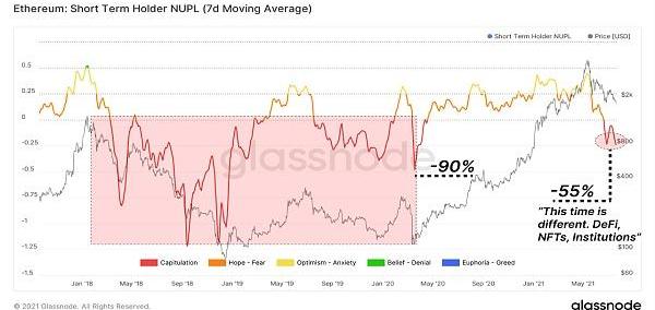 BTC链上估值指标SSR、STH-MVRV、NVT等均反映出7月份市场已出现极度低估的迹象,市场出现了良好的买入价位和时机。ETH的长期投资者占比逐渐提升,并且NUPL指标反映短期投资者同样出现了低位投降离场的迹象,市场筑底概率大增。