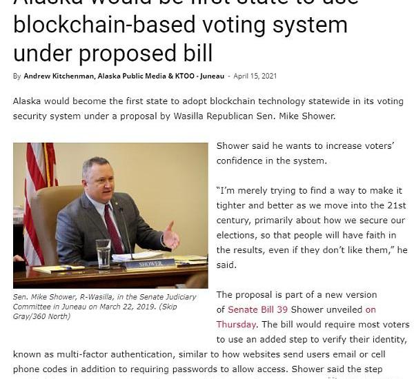 《根据提案,阿拉斯加将成为第一个使用区块链投票系统的州》详见:https://www.alaskapublic.org/2021/04/15/alaska-would-be-first-state-to-use-blockchain-based-voting-system-under-proposed-bill/