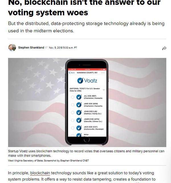 来自ArsTechnica的《基于区块链投票的选举将是民主的灾难》详见:https://arstechnica.com/tech-policy/2018/11/blockchain-based-elections-would-be-a-disaster-for-democracy/