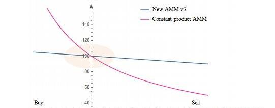 图5-3Mcdex的复杂AMM定价相对于简单AMM的定价曲线,蓝色为Mcdex定价