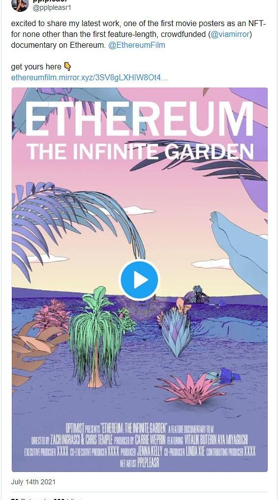 ScalarCapital的LindaXie正在帮助制作"Ethereum:TheInfiniteGarden",这是一部纪录片,现在正在Mirror上进行众筹。艺术家plpleasr创作了这部电影的海报制作!