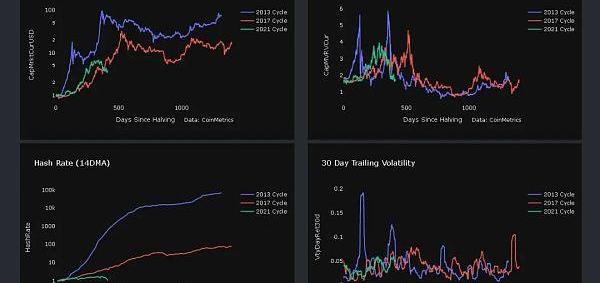 Coinmetrics表示,比特币的供应量每四年减少50%。到目前为止,已经有三次这样的减半,最近一次是在2020年5月11日。每一次减半都有效地预示着一个新周期的开始,2013年周期在第一个减半后370天达到峰值,2017年第二次减半之后524天达到峰值。第三次减半已经过去413天了。