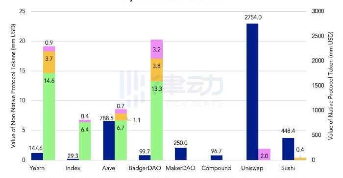 尽管许多DeFi项目现在明白将价值累积作为代币经济中一部分的重要性,但并非所有DAO都会将协议产生的费用/收入进行留存。例如Aave、Yearn、BadgerDAO和IndexCoop都会将协议收入保留在其DAO的金库中,但Sushi、Compound、Uniswap和Maker目前就不会这样做。与任何高增长公司类似,当投资于核心业务的投资回报率高于资本成本时,向股东支付「股息」是不合理的。此外,DAO还应该仔细考虑他们收入的组成结构:Aave和Yearn的大部分收入来自于生息稳定币,而IndexCoop的收入大部分来自于他们的高风险产品。因此,DAO至少应该保留协议收入的一部分,并仔细考虑这部分收入的组成结构。
