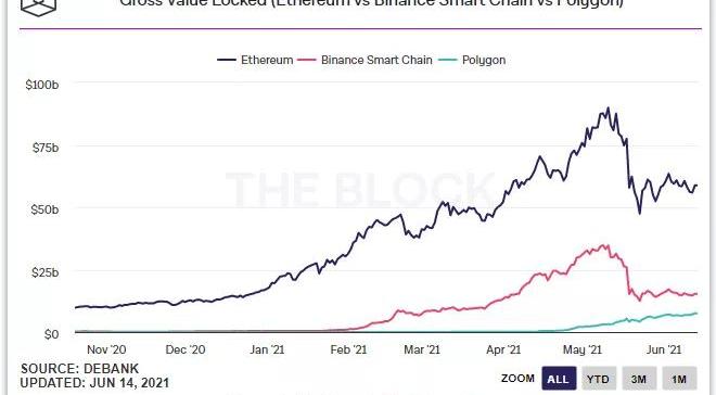上图:以太坊(黑线)、BSC(红线)和Polygon(绿线)上面的应用TVL变化趋势。