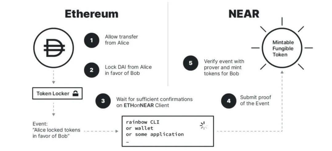 RainbowBridge的实现方式是:在NEAR上构建追踪以太坊数据的轻客户端智能合约,同时也在以太坊上构建NEAR的轻客户端智能合约。简单的来讲,也就是RainbowBridge会把NEAR上的数据传输到以太坊上,也会把以太坊上数据传输到NEAR上,这样以太坊和NEAR就可以相互读取数据实现相互跨链转账了。