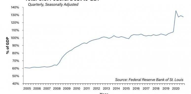 有一种解读是:美国政府通过刺激支票、部门救助、员工留用贷款、租金减免等措施防止了经济崩溃。这样一来,它就把私人债务转移到了公共账簿上。