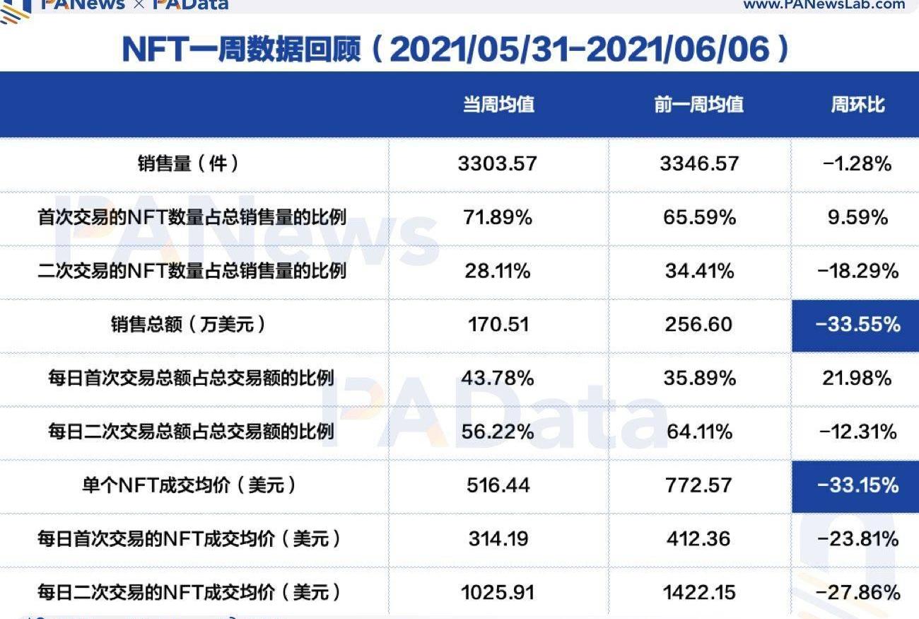 单个NFT成交均价周环比降超33%,一手和二手市场成交均价齐走低