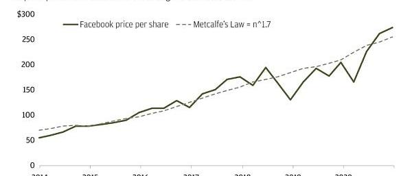 梅特卡夫定律帮助我们理解为什么Facebook现在是一家市值近1万亿美元的公司。从2014年到2020年,若将历史月活跃用户与流通股价格联系起来,我们可以以n^1.7的函数,使用「广义梅特卡夫定律」,对Facebook的历史股价进行估算。也就是说股票的价格可以通过活跃用户数量的函数来表示。例如,截至2020年12月31日,月活跃用户数为28亿人;这意味着FB的总价值约为2.8^1.7,即7250亿美元的市值,合每股约255美元。?该模型表明,自2014年以来,活跃用户数量每增加10%将转化为17%Facebook的价值增涨。