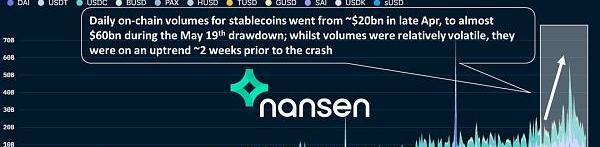 例如,稳定币的每日链上交易量在5月19日的大跌前一直处于上升趋势,随后在5月19日出现了飙升。