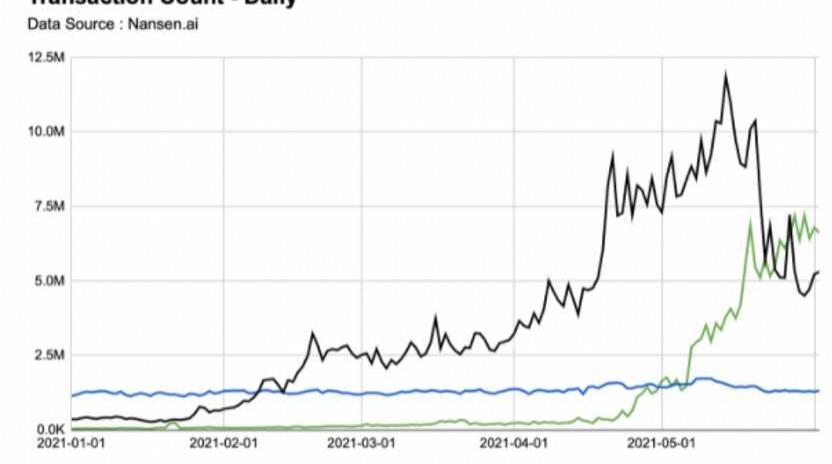 另一方面,以太坊的这些问题也给了币安智能链大放异彩的机会,币安智能链网络交易量已经从此前每天不到100万笔增长到高峰期时的1100万笔。虽然Polygon的增长速度相比之下曾经很慢,但更加稳定且有机。