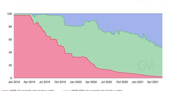 Tether在多个平台上发行,包括Omni、以太坊和Tron。在过去的一年里,Tether的供应已经转向Tron,现在占Tether总供应量的53%。