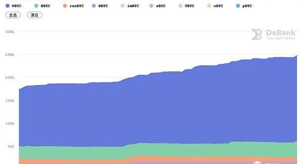 比特币锚定币的发行量也在持续增长,以太坊上的比特币发行量由21.67万枚增长到24.29万枚,增长12%。但增长部分大多来自于WBTC,增加了2.3万枚,而发行量位于第二位和第三位的HBTC和renBTC均有所减少。