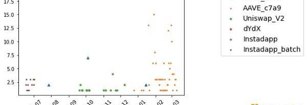 如下图为链上数据显示的批量闪电贷历史交易分布图,图中显示史上第一笔批量闪电贷为2020年6月17日Instadapp上发生的批量闪电贷交易。图中同时显示各个协议平台提供的批量闪电贷交易聚集在不同时间段,且存在似有后来者完全取缔前者批量闪电贷功能的现象。