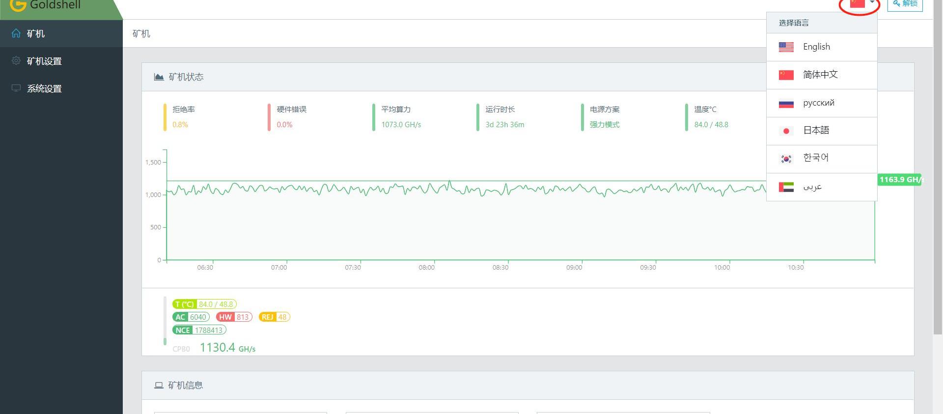 矿机插上电源和网线后打开电源按钮就可以开工了,网线接入Lan口,进入路由器后台查找下矿机的IP地址,再打开电脑浏览器输入找到的IP地址就可进入矿机控制页面。默认界面是,如需其他语言在控制页面右上角有个小国旗标志,点击就可切换。