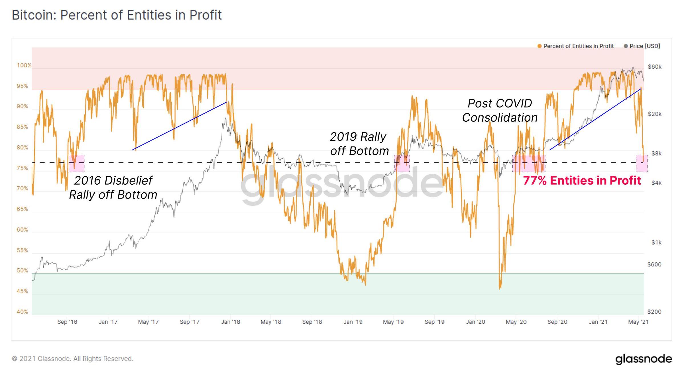 当前盈利的实体数量提供了对水下市场横截面的洞察。我们可以观察到,这次回调导致超过23%的链上实体处于亏损状态,而自2016年以来,可比较的有三个上升趋势期。请注意,所有这些比较性回调都与相对极端的事件有关: