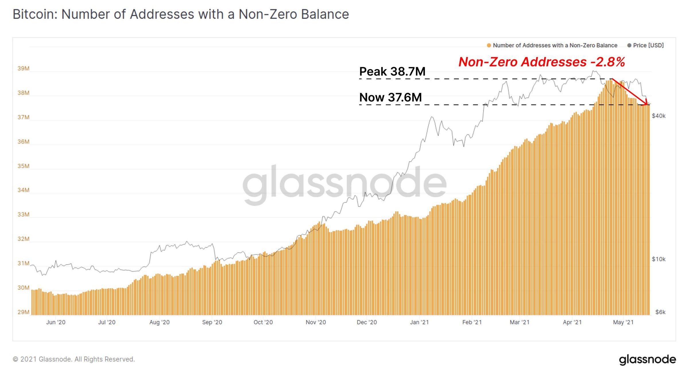 拥有非零BTC余额的地址总数也从最近3870万个地址的历史高点下降了2.8%,共有110万个地址在这次回调期间出掉了他们持有的所有币,这再次提供了目前正在经历的恐慌性抛售的证据。