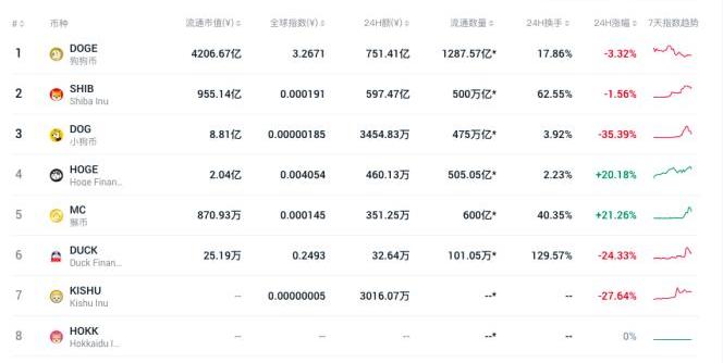 有趣的是,诞生时间更久、本轮牛市最早爆发的狗狗币,在高潮阶段被市场晾在了一边。资金轮番涌入各种不知由谁发起的仿盘中,凭空造就了一个个百倍币神话。